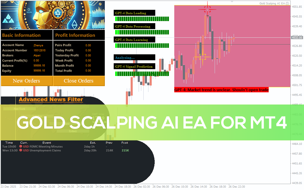 Gold Scalping AI EA is an MT4 expert advisor designed for XAUUSD scalping using AI-based trend filtering and risk control.