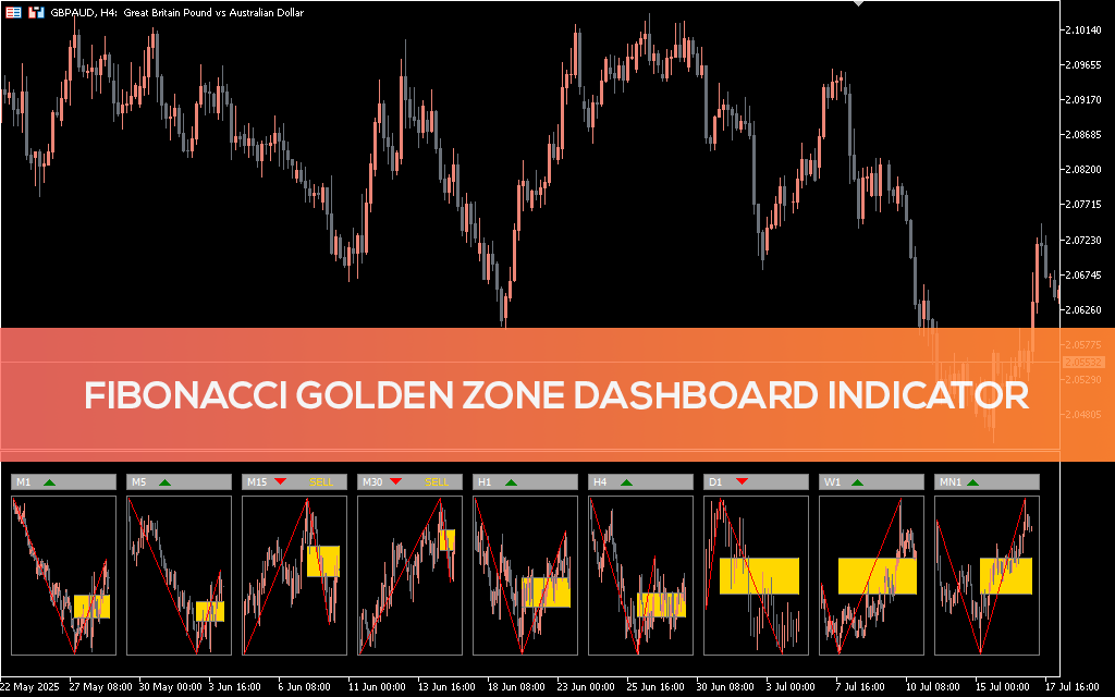 Explore the Fibonacci Golden Zone Dashboard for MetaTrader 5. Instantly monitor Golden Zones across all timeframes using ZigZag structures. Get alerts and stay in sync with key reversal areas.