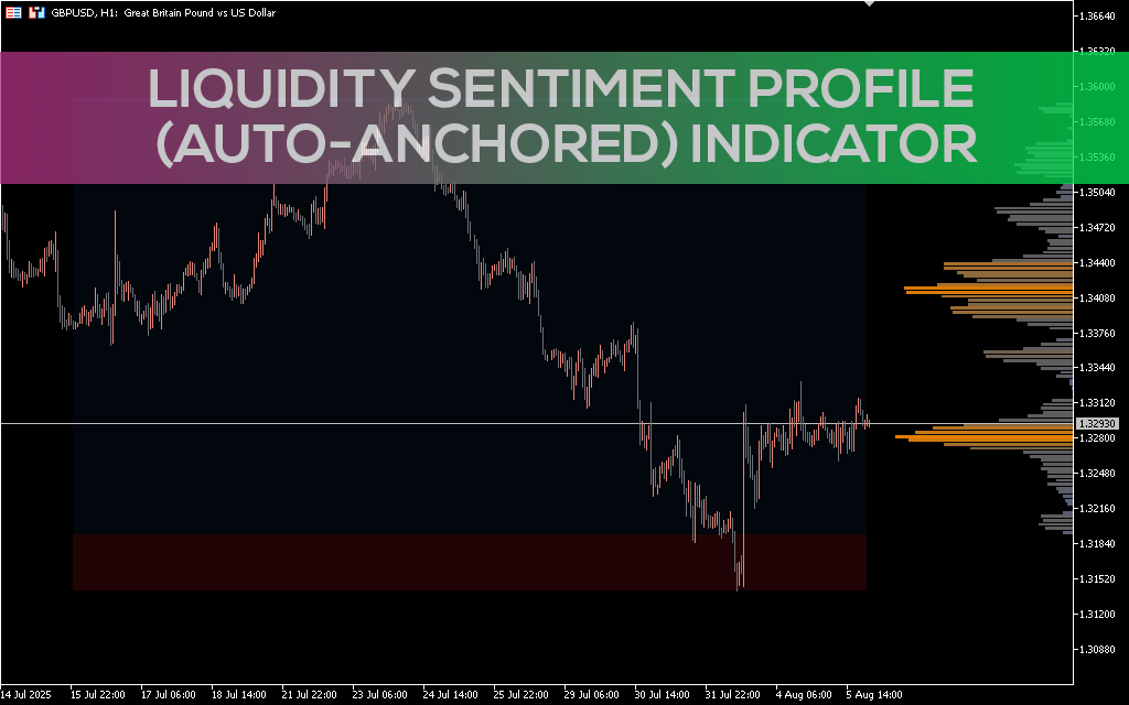 Analyze market liquidity and sentiment zones in real time with the Liquidity Sentiment Profile (Auto-Anchored) MT5 indicator. Precise range mapping, volume, and price levels.