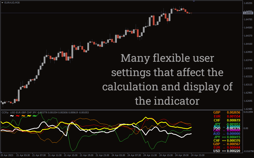 The CCFp indicator displays the strength and weaknesses of a financial trading asset.