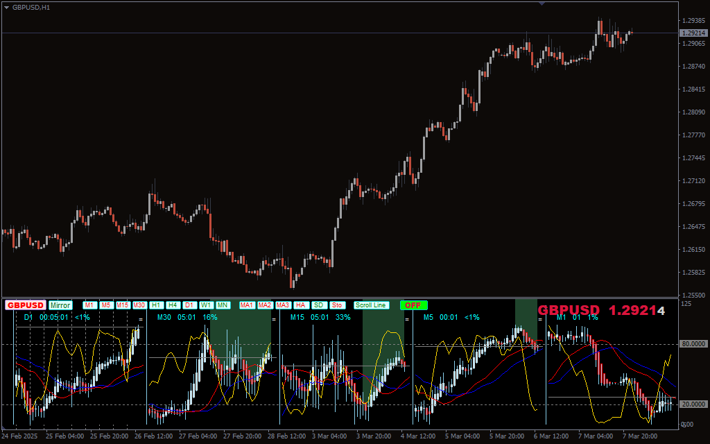 Download the Multi Chart Multi Time Frame Indicator for MetaTrader 4 to analyze multiple timeframes simultaneously. Improve your trading strategy with a detailed overview of market trends.